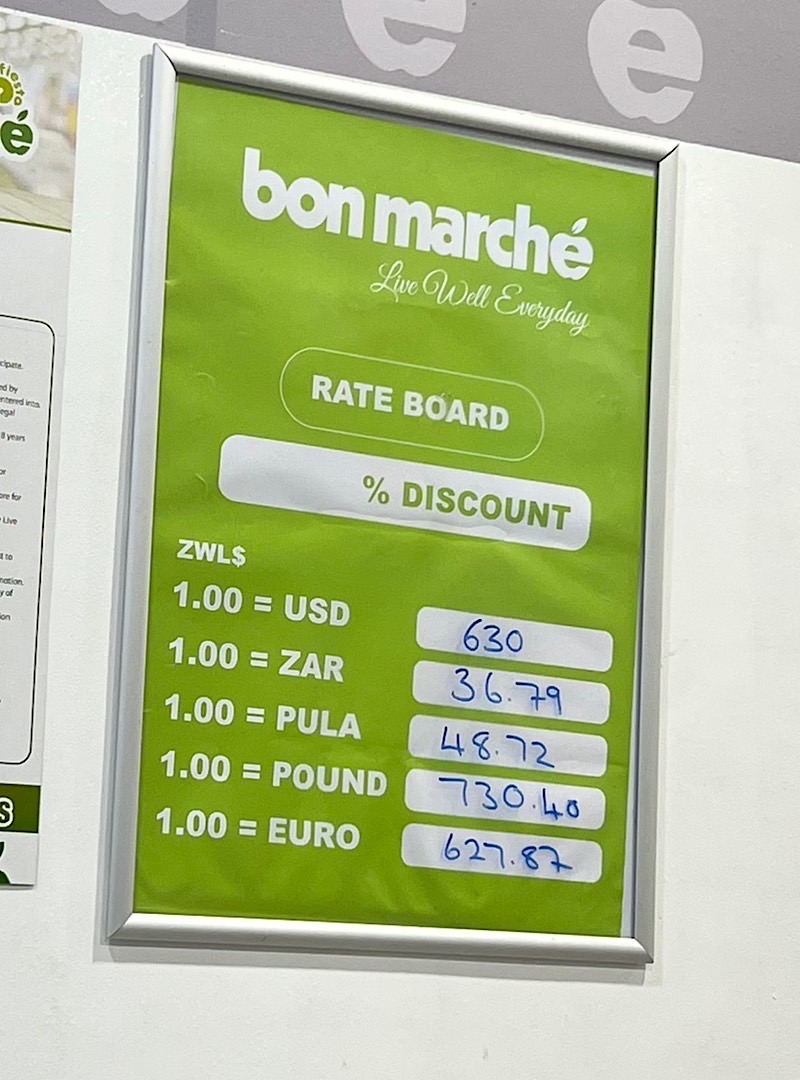 Since the exchange rates to the Zimbabwe Dollar change all the time many shops have these boards showing the daily rate. Depending on the rate the shop uses you then decide if you pay in USD or RTGS (Real Time Gross Settlement = digital Zimbabwe Dollar)