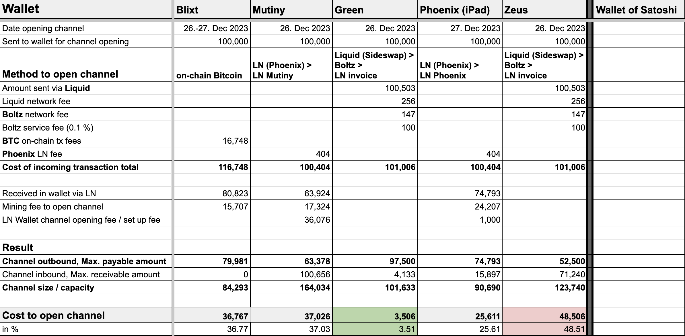 The available balance after opening the channel varied significantly. Zeus had the lowest balance of 52,500 sats, while Green had the highest at 97,500 sats. This difference was surprising, especially since I used Liquid for both. Green was the clear winner with a cost of 3.5 percent, whereas Zeus was by far the most expensive wallet with 48.5% of the funds spent in opening the channel.