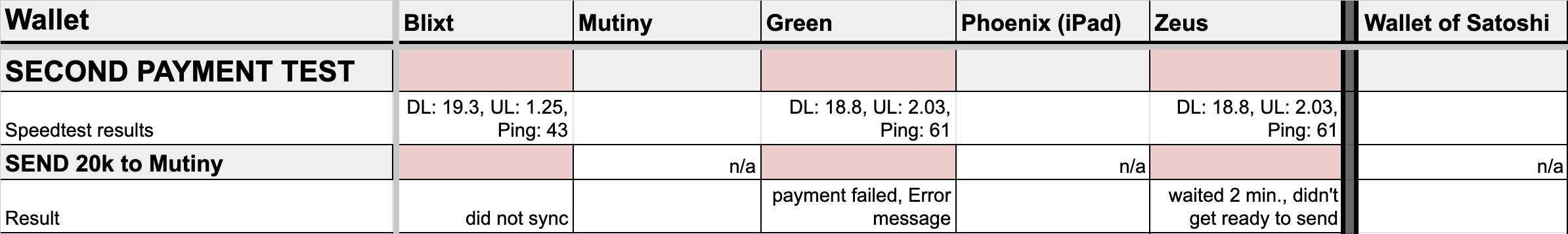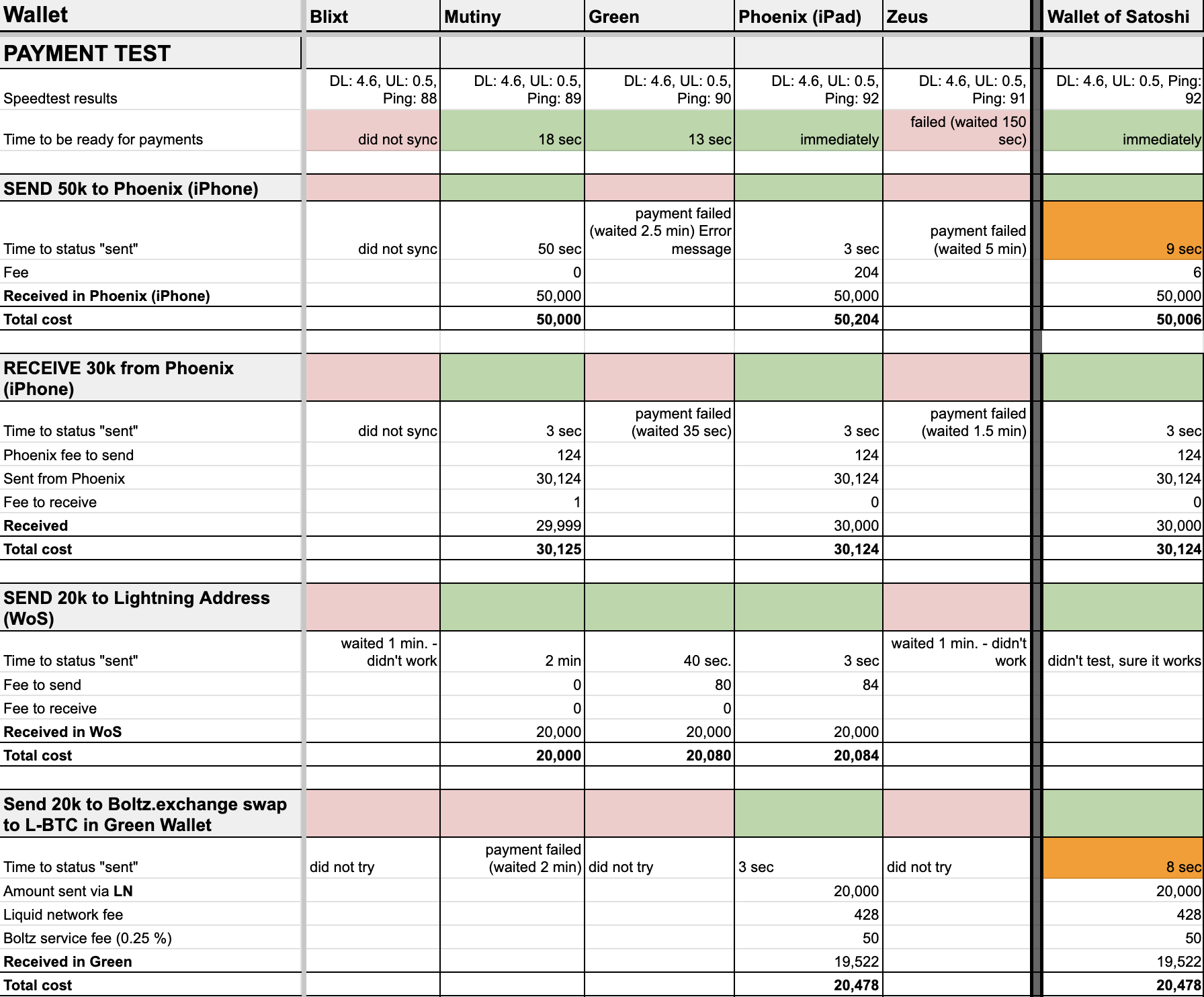 In terms of payment reliability, Phoenix and the Wallet of Satoshi stood out as the most dependable. This isn't surprising for the Wallet of Satoshi, given its custodial nature. Following closely was Mutiny, which successfully completed three out of four payment attempts. Green, however, managed only one successful payment out of four.