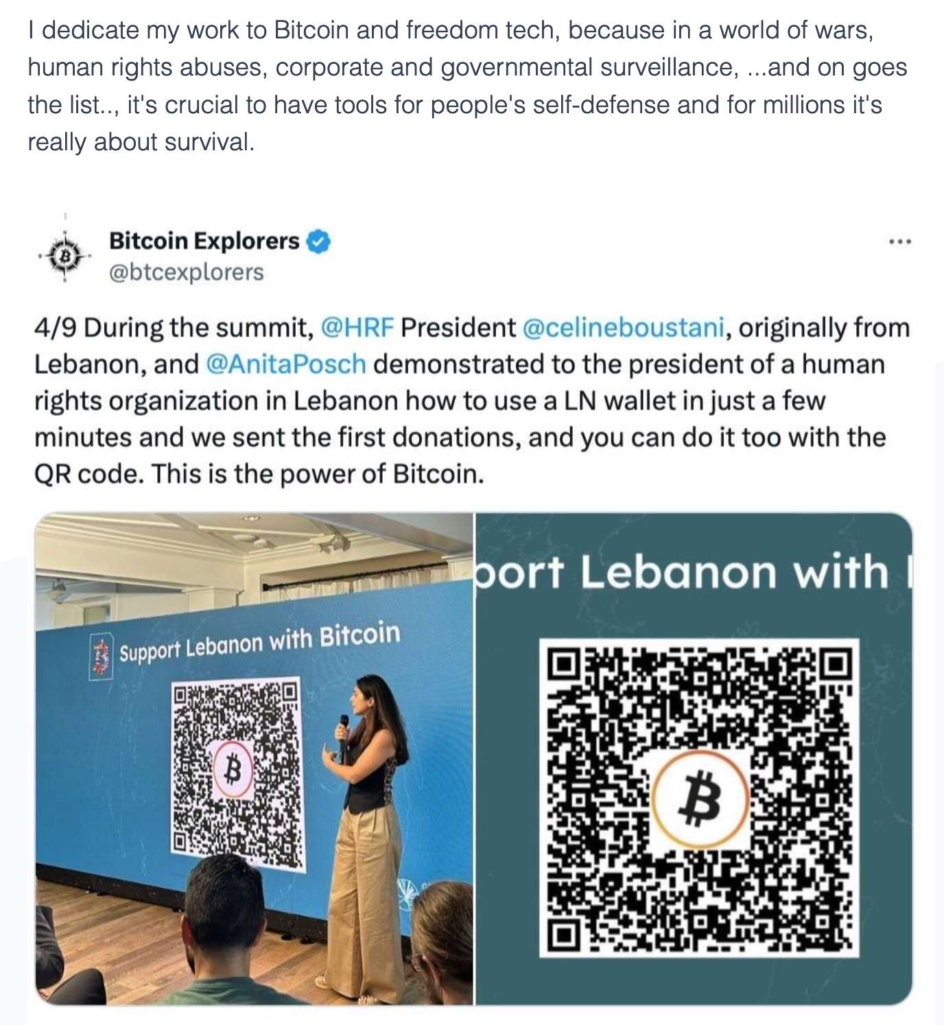 To me, the most special event of the year was the donation demo at the Human Rights Foundation Global BTC Summit in October. From opposite sides of the world, I guided the boss of a Lebanese human rights organization through setting up a Bitcoin wallet via messenger. Within an hour, they were ready to receive emergency relief donations - a powerful moment that showed Bitcoin's borderless potential. It reminded me why I’m so passionate about the work I do.