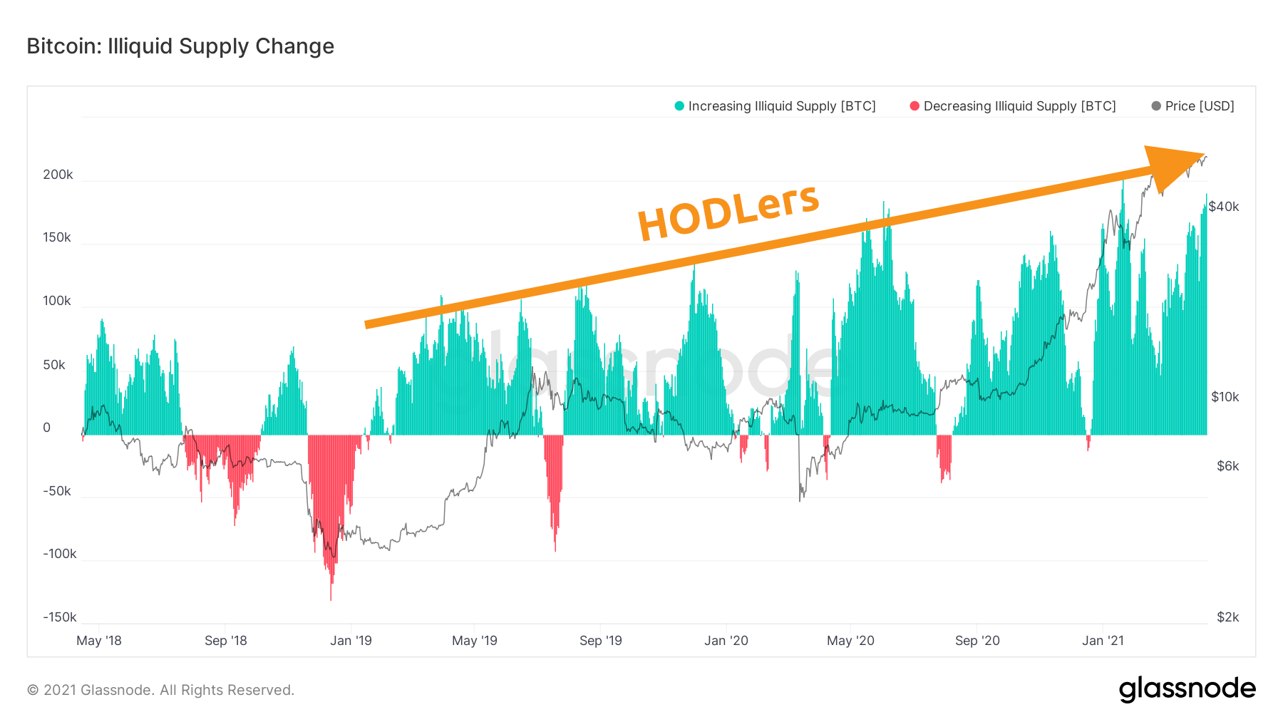 This chart shows the increase of illiquid supply since 2019. Illiquid supply are bitcoin that have not been moved for a longer period of time. Consider long-term investors who keep their BTC locked in a cold wallet with the intention of holding it for long periods of time: Their BTC is practically removed from the liquid portion of the Bitcoin supply that is in circulation and accessible for trading. In contrast, exchanges with constant in- and outflows directly contribute to the pool of liquid supply. glassnode - supply