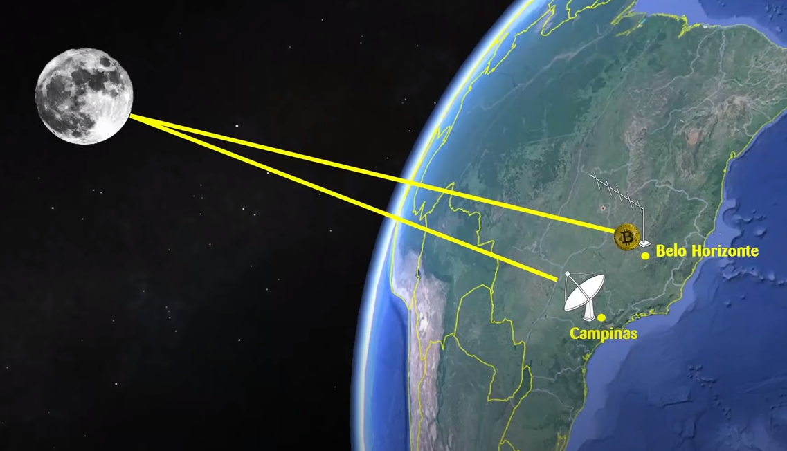 And that's how it worked: A Bitcoin transaction is like a small text file, this text file was morsed and transmitted over radio signals to the moon, where the signal was mirrored and sent back on earth to 600km away Campinas.