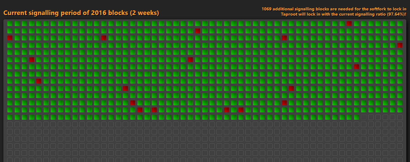 Last week I was explaining the advantages of a technical improvement of the Bitcoin software called Taproot, which improves scalability, privacy and sets up foundational scaffolding for future improvements. All decisions in Bitcoin to adapt the software have to be community-based. Any user can decide freely which software version to run. In the last weeks the miners had the possibility to signal, if they will adapt taproot or not. Now 97% of all miners are sending positive signals in their blocks, which means that in about 10 days Taproot will be automatically locked-in and the soft-fork will be deployed in November. This is great news and a huge step forward in strengthening Bitcoin's privacy, neutrality and permissionlessness, which makes it unique in the whole cryptocurrency space.