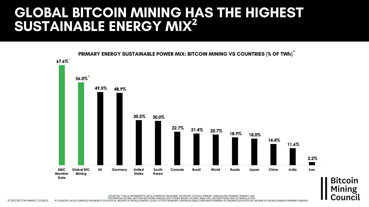 Mining council members energy mix is 67.6% from sustainable resources, which is higher than the global miners mix of 56%, both higher than the EU and Germany which are around 49%. Bitcoin's energy mix is already more sustainable than the grid sources all around the world.